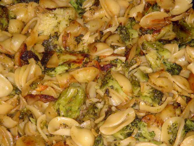 Die gekochten Orecchiette abgießen und in die Pfanne dazugeben.